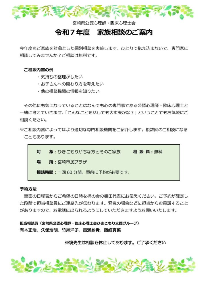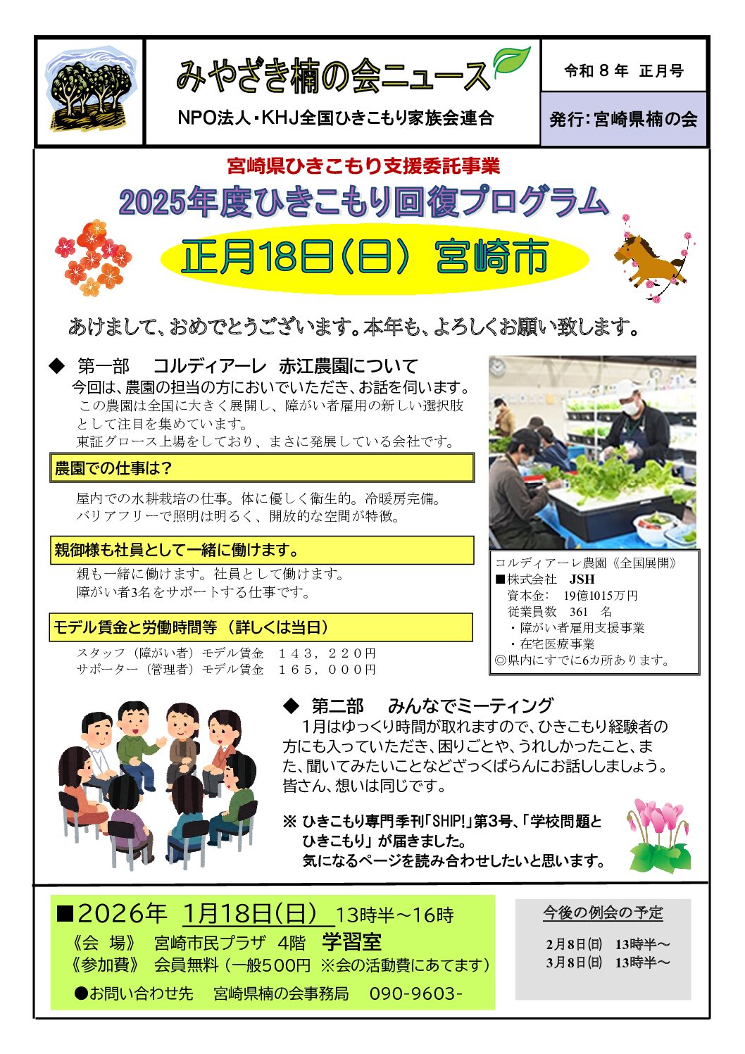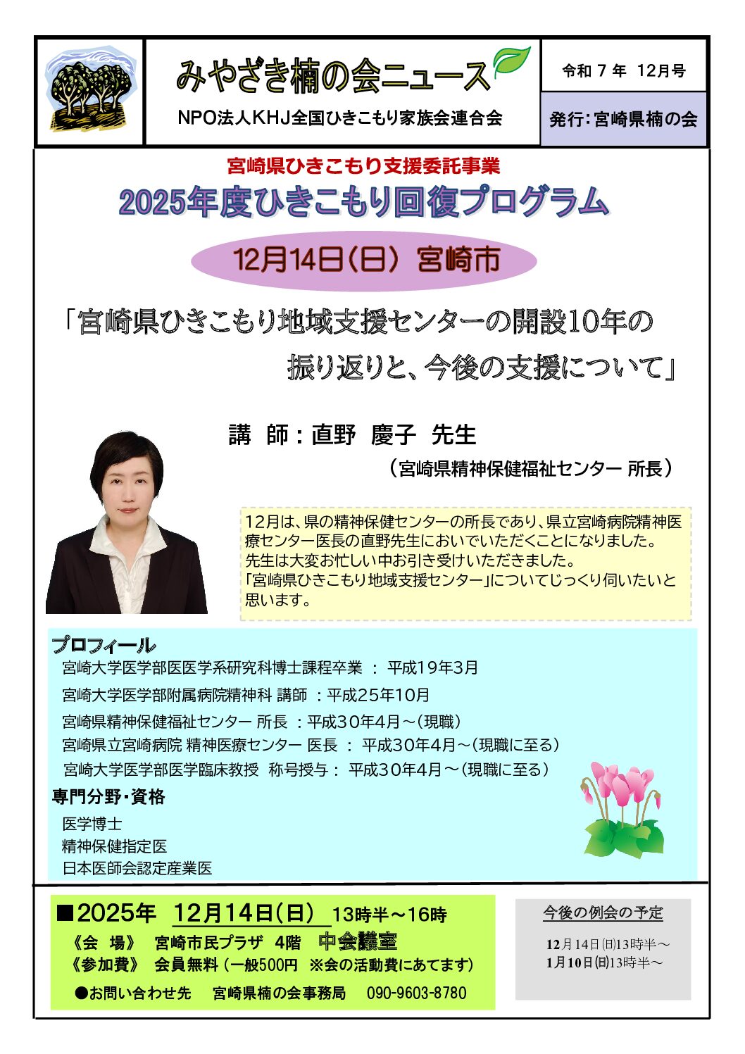 宮崎県楠の会は「ひきこもり」の子を持つ親の会です。毎月の定例会を中心に、学習会・講演会・施設見学などを行いながら、当事者の社会復帰や社会的な支援制度の確立などを目指して活動しております。